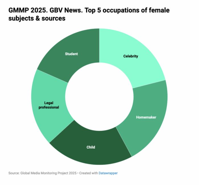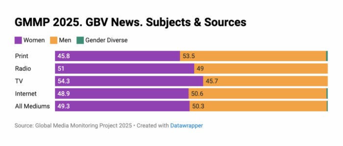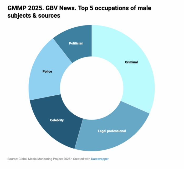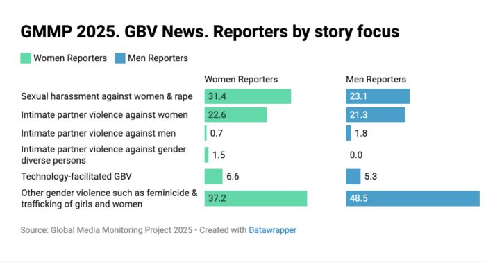 Gli uomini dominano come giornalisti in tutti i settori dell’informazione. Tuttavia, quasi il 3% delle giornaliste riporta notizie relative alla violenza di genere, rispetto a poco più del 2% dei giornalisti uomini. La violenza di genere ha maggiori possibilità di ottenere visibilità nelle notizie se il giornalista è una donna.