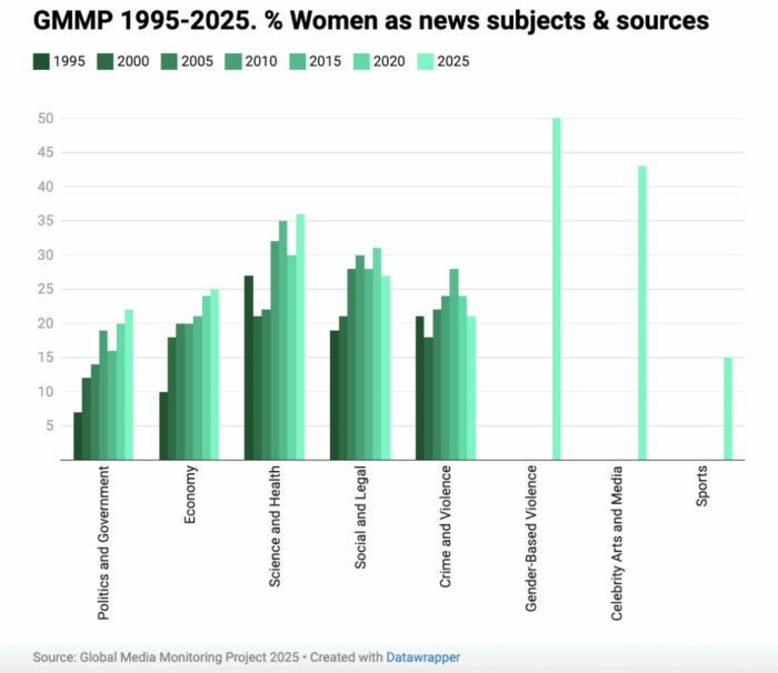 La Piattaforma di Pechino ha chiesto alle donne pari accesso all’espressione mediatica e al processo decisionale. Tre decenni dopo, il 41% dei giornalisti che scrivono articoli di cronaca tradizionale sono donne, un miglioramento rispetto al 28% del 1995, ma ancora non pari.